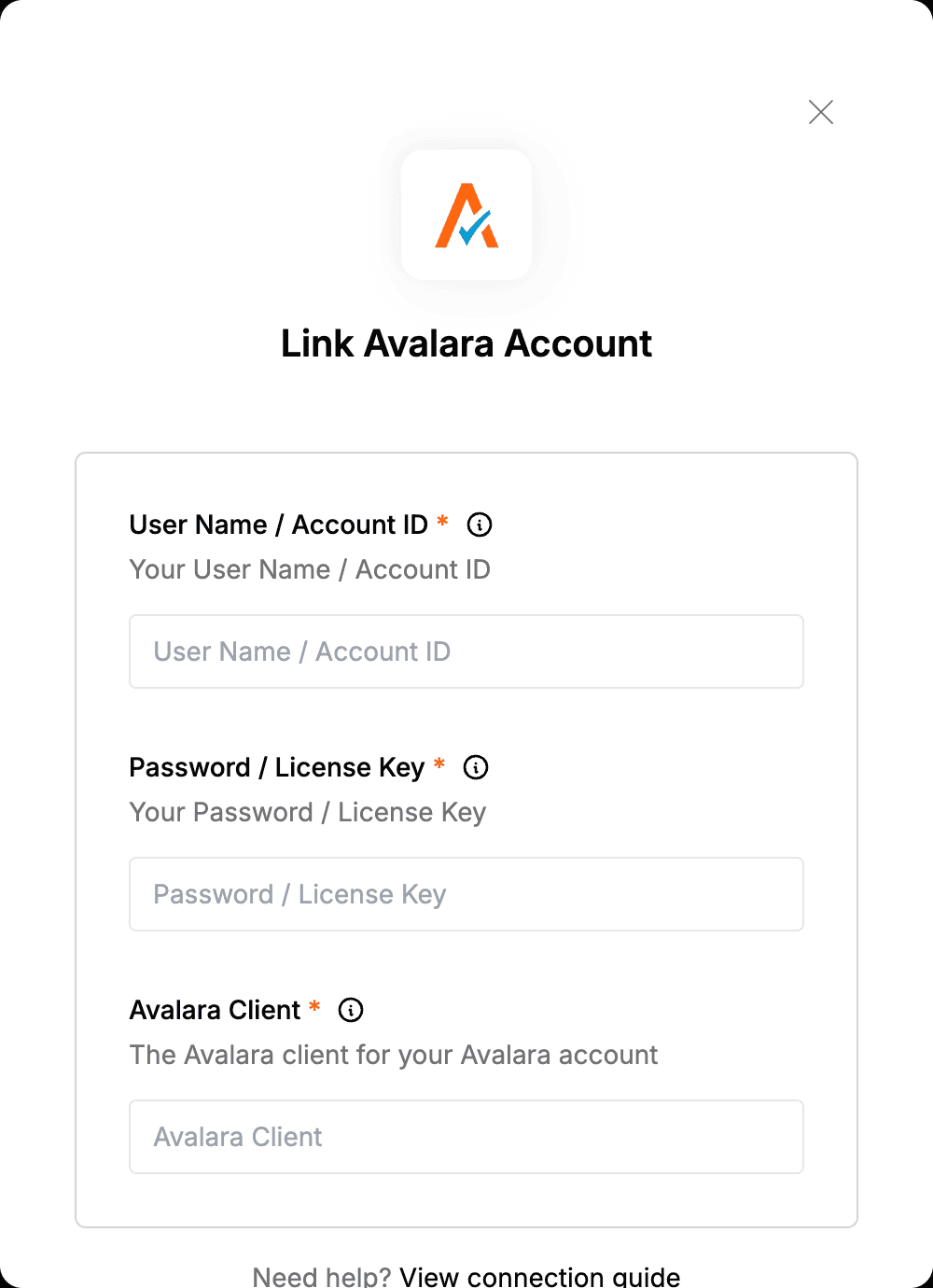 - You can use your username/password pair for authentication, or alternatively, opt for the Account ID/License Key pair. To obtain the later credentials, log in to your Avalara dashboard.